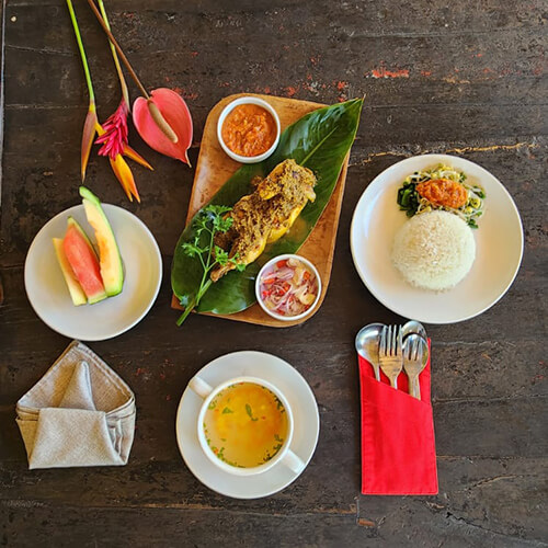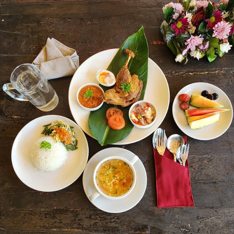 Roasted duck Balinese spice, served with vegetable, steamed rice, sambel, salted egg, Mineral water, Seasonal Soup or Garlic bread, Sliced of Seasonal Fruits