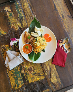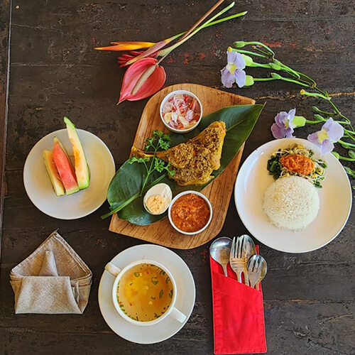 Deep fried crispy duck turmeric marination, served with vegetable, steamed rice, sambal. Salted egg, Mineral water, Seasonal Soup, Sliced of Seasonal Fruits